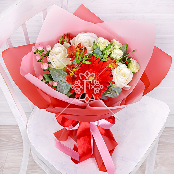 роза белая – 3 шт., роза белая кустовая – 1 шт., гербера красная – 1 шт., альстромерия красная  - 1 шт., гиперикум белый – 1 шт., зелень декоративная (эвкалипт), упаковка, лента.