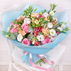 роза  розовая – 3 шт., альстромерия розовая – 2 шт., эустома белая – 3 шт., гвоздика персиковая – 2 шт., гиперикум белый – 1 шт., хлопок – 1 шт., зелень декоративная (эвкалипт), упаковка, лента.