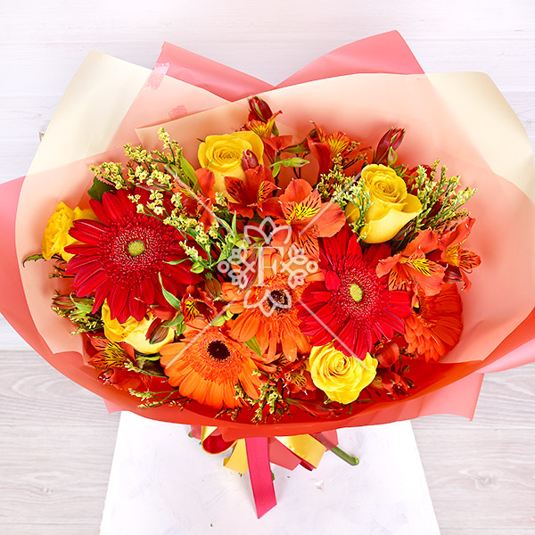 Удивите и порадуйте дорогого человека, вручив букет из солнечно-желтых роз, ярко-оранжевых и насыщенно-алых гербер, чудесной красной  альстромерии  и нежного лимониума. Эта цветочная композиция выглядит ярко, стильно и совершенно!